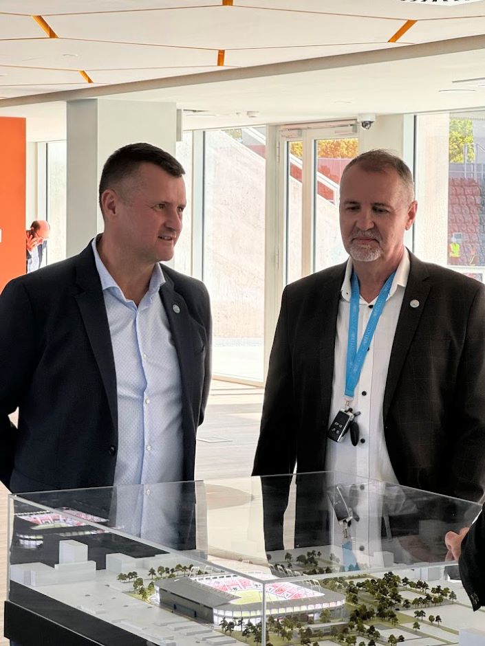 2024.05.14.-én dr. Kovács Ferenc Nyíregyháza polgármestere és Nyul Zoltán magasépítésért felelős helyettes államtitkár sajtóbejáráson mutatták be a Nyíregyházi Város Stadiont és Multifunkciós Sportközpontot.